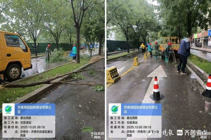 10月5日清晨6时50分,历下区园林绿化服务中心工作人员巡查发现,燕子山西路南首路东一棵国槐倒伏影响交通,立即安排人员、机械赶赴现场冒雨处置,用时30分钟处理完毕恢复通行。