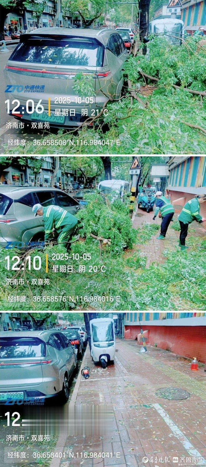 10月5日上午8时,历城区园林和林业绿化局现场巡查发现,唐冶西路出现行道树断枝影响交通的情况,随即安排人员进行紧急处置,8时20分处理完毕恢复通行。